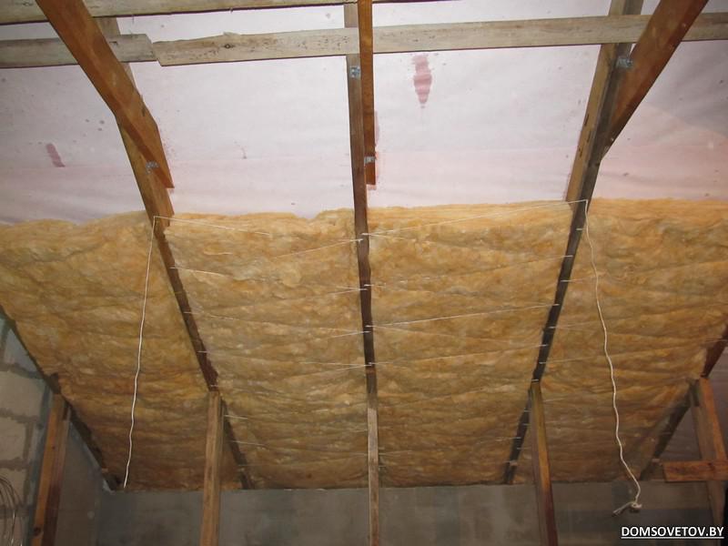 Делал у себя как на картинке у Будаўнік, Только зазор между мемраной не делал и крепил утеплительснизу предварительно шпагатом на степлер, затем степлером же пристреливал пароизоляцию и только потом подшивал доской. В доску по два шурупа, что бы не покрутило. Без доски только на веревке утеплитель сильно провисает. Наверное если использовать фасадный то такого не было бы, но он дороже.