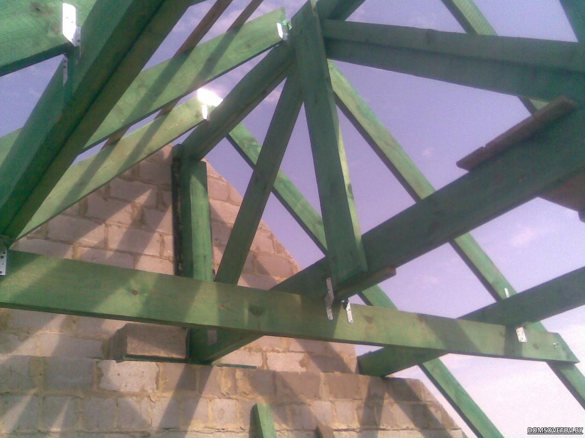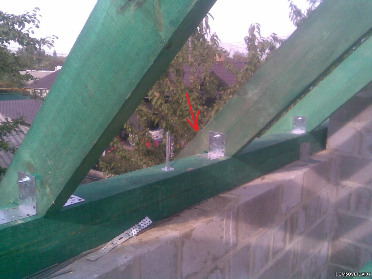 и есть некоторые сомнения в конструкции не то , чтобы я спец. но ... 1/ стропила уперты в друг друга . и они не давят на ферму. обычно- конек ставят , если стропила лежат на нем "свободно"- с ходом. а в этом случае конек типа не нужет вообще. как и ферма. защемил и всё. 2/концы на мауэрлате и коньке жестко закреплены.(так не делают) 1+2= прогиб стропил и выпирающее усилие при большой нагрузке. но я думаю нагрузка тут не будет большой. у вас стропила=200мм= можно вообще посчитать и не делать прогона. угол-то 45 гр. проекция 3.5м. надо было шагом чаще . и не сочинять. 3/на мой взгляд перепутаны опирания на прогон и ферму (стяжка ригель подвешена снизу к ферме и прогону. что это дает?) 4/прогон сплачивают в высоту , в не в толщину(я правда не вижу всего прогона с серединой). 5. я могу ошибаться в силу того что плохо вник в конструкцию крыши. но уж больно много эээээ неувязок. 6/ да вот ещё. деревянные фермы шипуют пластинами . штобы не расколоть и чтобы была жесткость(фермы=жесткость). |