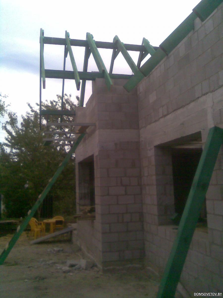 1/ стропила уперты в друг друга . и они не давят на ферму. обычно- конек ставят , если стропила лежат на нем "свободно"- с ходом. а в этом случае конек типа не нужет вообще. как и ферма. защемил и всё. – Согласен, но не совсем, я стропила в районе конька очень плотно и жестко обвязал и зафиксировал на ферме, как бы повесил их на нее. А на мауэрлате не так жестко (хотя до него дойдем ниже) 2/концы на мауэрлате и коньке жестко закреплены.(так не делают) 1+2= прогиб стропил и выпирающее усилие при большой нагрузке. но я думаю нагрузка тут не будет большой. у вас стропила=200мм= можно вообще посчитать и не делать прогона. угол-то 45 гр. проекция 3.5м. надо было шагом чаще . и не сочинять. - страпила к мауэрлату крепятся через мет, уголки с помощью шпилек к страпиле (тут жестко я согласен), а к мауэрлату 8 гвоздей на срез, не мог же я вообще ничем его не зафиксировать (я имею ввиду всю крышу к мауэрлату), а просто положить на него, да и зарез выполнен так что стропила по мауэрлату под действием распора смогут немного разойтись по горизонтали (я надеюсь какае-то свобода у них есть). 3/на мой взгляд перепутаны опирания на прогон и ферму (стяжка ригель подвешена снизу к ферме и прогону. что это дает?) - стяжка ригель удерживают стропила от того чтоб они на «разъехались» за одно и основание для потолка мансарды, а опирать ее на ферму я не увидел смысла, а вот опустить ее как можно ниже к полу мне показалось более правильно. А то что я ее прихватил на подвесы к ферме это уже попутно, гвоздей не жалко. 4/прогон сплачивают в высоту , в не в толщину(я правда не вижу всего прогона с серединой). - тут что то я не понял о чем речь, может как то по другому на кортинках… 5. я могу ошибаться в силу того что плохо вник в конструкцию крыши. но уж больно много эээээ неувязок. - буду очень признателен если смогу их все выявить и уничтожить, так как еще есть 3-4 дня до покрытия черепицей. 6/ да вот ещё. деревянные фермы шипуют пластинами . штобы не расколоть и чтобы была жесткость(фермы=жесткость). - крепеж еще не весь прибит и прикручен, на фото все только наживлено. |