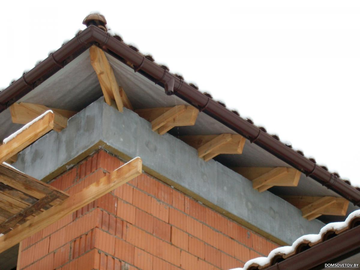 Весь сыр-бор именно вокруг этих усиливающих элементов. При свесах в среднем 85-90 см. строители считают, что эти элементы нужны. Говорят - "хотите убрать - уберем. Но тогда крыша на ваш страх и риск..". Поэтому и решил обратиться за советом к опытной общественности... :bc: Узлы смогу выложить только в пятницу. Пока есть только 1 фото "вид снизу". Стропило к мауэру врезано "зубом", и затем на уголки. Мауэр на армпоясе через шпильки. А эти усиливающие элементы шурупами прикручены к стропилам и упираются только в наружнюю стену. to sergN : если вы имеете в виду зашить по горизонтали, но по нижнему краю стропил (а не по элементам), то не выйдет. Водосточка висит выше, чем нижний край ног. |