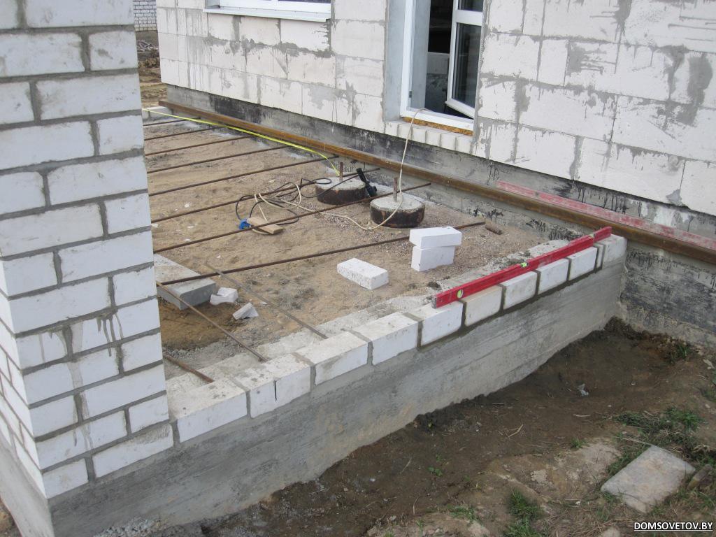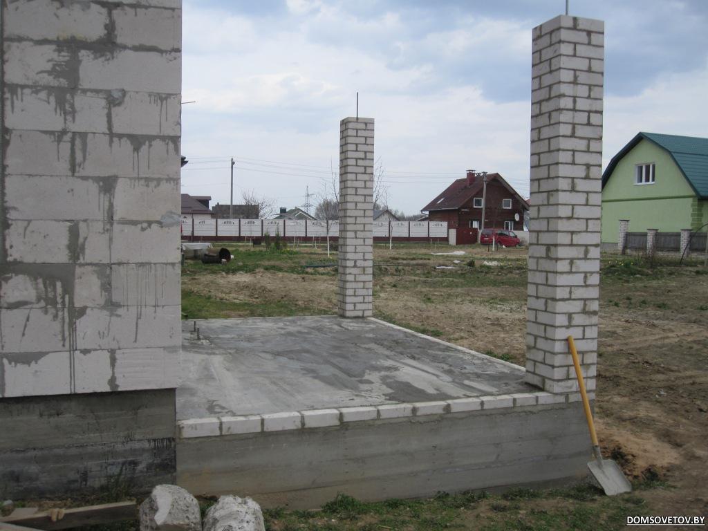 Закончил колонны, на один уровень выводил с помощью нивелира, очень удобно, можно делать без помощника, на готовую колонну подвешиваю рулетку и отмечаю произвольный уровень на обоих колонах, потом выдерживаю расстояние от метки до верха. На второй колонне пришлось для этого использовать одинарный кирпич для последнего ряда, т.к. за счёт 28 швов набежала разница в 3 см! Таким образом верх опор совпадает с точностью до миллиметра. Полости проармировал и залил бетоном, сверху вставив шпильки под брус, под рукой оказались d20, их и поставил. Фундамент засыпан ПГС внутри, приблизительно слой около 70-80 см, трамбовать его почти бесполезно, за зиму немного уплотнился. Поэтому решил под стяжку - плиту слегка проармировать, на её заливку пошло ровно 2 куба бетона, заказывал миксером у Дениса. http://www.domsovetov.by/showthread.php?t=2945