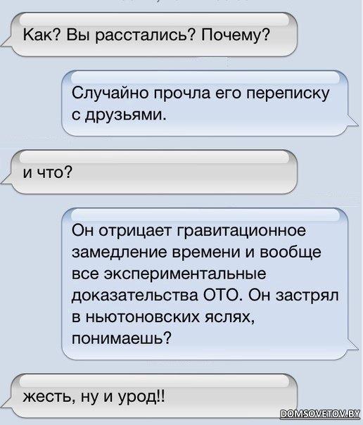 Подборчка Знакомства: Если вам скучно и вы одиноки, симпатичная женщина с четырьмя детьми сделает вам весело. Есть такие цитаты, которые очень нравятся и точно описывают твое состояние, но репостнуть не можешь, ибо палевно... Поговорил с соседкой-бабушкой у своего подъезда. Расспрашивала где я работаю, сошлись на том что на работе я занимаюсь установкой окон (windows), а для души развожу пингвинов (linux). Вопреки всем законам физики: чем сумка с деньгами тяжелее - тем с ней легче... ХУДЕЮ - НО, ЕМ ВСЁ ПОДРЯД... НАВЕРНО, Я ПОХУДИСТКА!! Бензин дорожает, продукты дорожают, тарифы ЖКХ дорожают. И только на яхты цена снизилась! Радость пришла откуда не ждали! Из набора трех явлений: наличие детей, порядок в доме, нормальная психика — одновременно можно иметь только два. - А ты не подарок! - Да и ты не праздник. Хотелось отложить денег на старость. Не получается. Придётся отложить старость... Идёт налево - песнь заводит, направо - сказку говорит. Не думайте, не кот учёный, женатый просто этот тип. Вышел украинский аналог куклы Барби - «Маруся». В комплект входят: ее друг Иван, хата, летняя кухня, 2 гектара поля, отрава от жуков и Чупакабра. Ведь был красив, умён... зачем трезвела?.. Оказалось, если не афишировать свою личную жизнь, то любопытные люди сами вносят в неё до хрена креатива... |