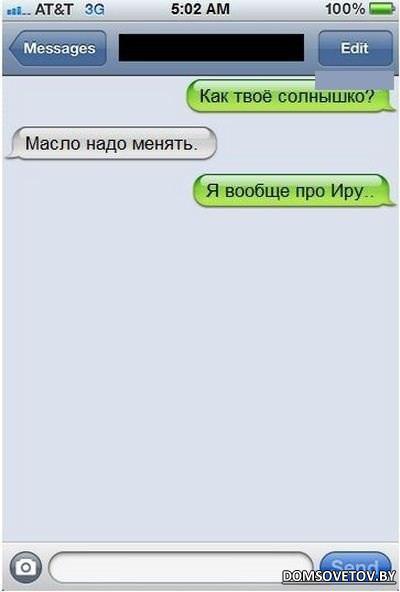 - Ты даже не представляешь, какая это двусмысленная фраза. - Да нет, ты всё не так поняла. я просто другу помогал. - Ты просто издеваешься над моей фантазией)))) ---------- Сообщение добавлено в 16:10 ---------- Предыдущее было в 16:08 ---------- Переполненный автобус. — Женщина! Куда вы прете?! — Это не я! Это меня прут! ---------- Сообщение добавлено в 16:11 ---------- Предыдущее было в 16:10 ---------- - Розочка! Я тут в интернете прочитал, шо 2012 год переживут только те знаки гороскопа, у которых-таки есть рога - Овны, Тельцы, Козероги! А я Скорпион... Шо делать будем, Роза?! - Моня, не шкварчи... . , все шо смогла... , уже сделала! Жить будешь долго и счастливо! ---------- Сообщение добавлено в 16:45 ---------- Предыдущее было в 16:11 ---------- Продаю свадебные платья. Размеры - 44,46,48,50,52,54.. Нет сил больше ждать!!! Люся. |