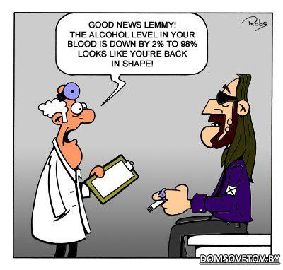 "Хорошие новости, Лемми! Уровень алкоголя в вашей крови понизился на 2% до 98%. Похоже, вы возвращаетесь в форму!"