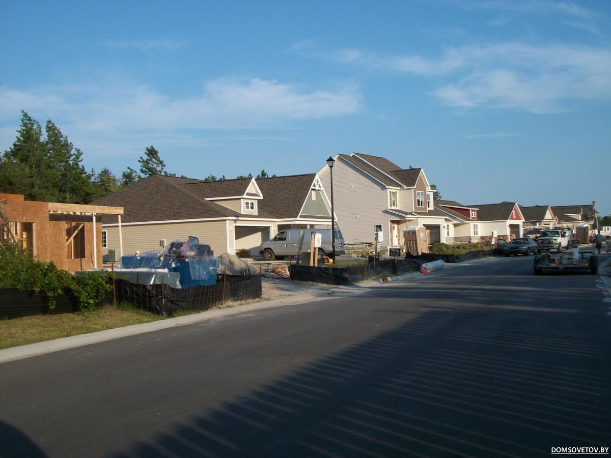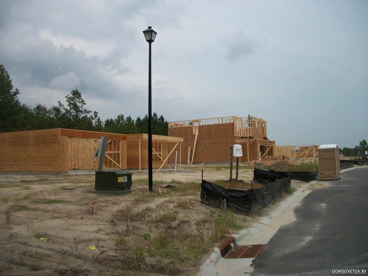 Приезжала свояченица летом и привезла мне для общего развития немного фото. Итак, начнем. Город Ждексонвилл, штат Северная Каролина. Пускай не пугает слово северная, климат теплый, зимой отрицательных температур не бывает. Строится сразу целая улица. Сразу скажу с домами там никто не парится. Не снимая никакого грунта выставили опалубку и залили плиты, предварительно подведя все коммуникации.