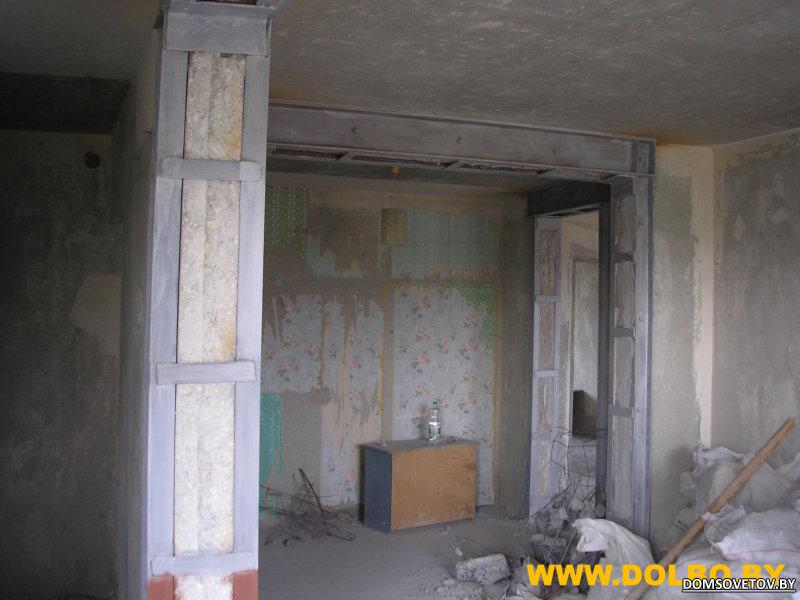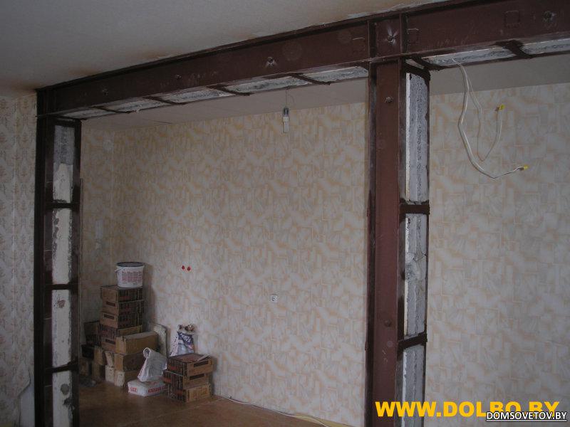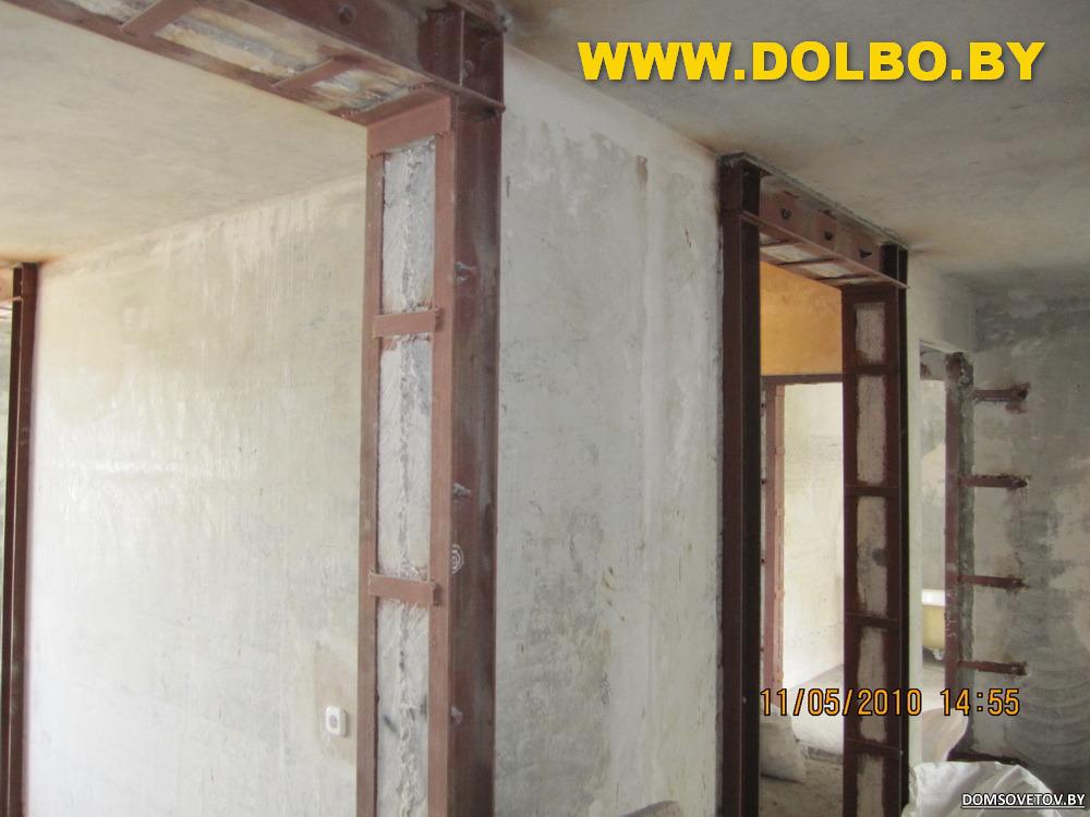 Двухрядовое (портальное) усиление опорными металлическими рамами из швеллеров. http://www.dolbo.by/images/stories/s...proem_anim.gif Наиболее распространенный для панельных домов метод. Область применения: • Проемы в железобетонных стенах панельных домов; • Проемы в железобетонных стенах монолитных домов; • Проемы в несущих стенах кирпичных, каракасно-блочных домов. http://www.domsovetov.by/picture.php...pictureid=1020 http://www.domsovetov.by/picture.php...pictureid=1029 http://www.domsovetov.by/picture.php...pictureid=1028 Порядок производства работ (ППР) (точно определяется только утвержденным проектом):