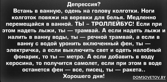 Фишка в том, что мы думаем, что депрессия - это болезнь ума. А на самом деле, депрессия - болезнь тела. Наше настроение - сплошная химия, и как бы нам ни хотелось верить в торжество человеческого разума, если что-то ломается в сложном механизме под названием мозг - это не лечится силой воли. Простуду же силой воли никто не лечит? А депрессию, почему-то, пытаются =) "Соберись, тряпка", "это просто все от безделья", "перестань придумывать плохие мысли" - это все замечательно, но это не про депрессию. Печаль в том, что отличить депрессию от обычного ****острадания очень сложно не только со стороны, но и самому человеку, находящемуся в этом состоянии. Он думает, что, может быть, это все от стресса и усталости, может быть, достаточно просто принять ванну с пеной, скушать бананчик или шоколадку, пойти нажраться и трахнуть кого-нибудь (и прочие "полезные советы" а-ля женский говножурнал). И если это сработало, то человека можно только поздравить - депрессии у него просто не было. А если не сработало и депрессия есть, то такие советы вредят еще больше, потому что человек начинает верить в то, что это он САМ виноват. И вот с этого начинается хроническая депра, которая может длиться десятилетиями. Это страшно. Как-то давно я тусовалась на одном специализированном форуме со своими страхами полетов. Навидалась там такого, чего врагу не пожелаешь. Я узнала, что есть люди, которые по 10 лет не выходили из дома. То есть, вообще не выходили, совсем. Агорафобия. Я тогда думала - бля, ну как же можно запустить свое состояние до такого? А очень просто. Так же, как люди запускают депрессию. Им же со всех сторон твердят, что они себе что-то выдумали, что это они САМИ виноваты, что надо просто перестать выдумывать и все сразу само рассосется. Собственно, не так давно к какому-то посту я получила от кого-то дословно такой комментарий, что люди сами себе неврозы выбирают. И вот человек, находясь еще не в самом запущенном состоянии, пытается САМ прекратить болезнь. Силой мысли, блеать =)) А социум в этом еще активно помогает. Это ужасно, на самом деле. У человека биохимия мозга нарушена, а он себе твердит: "Улыбайся давай! Улыбайся, блеа!" - и его еще в этом поддерживают. Ну прямо по библии: "Встань и иди". И вот в этот момент, когда еще легко и быстро можно было все поправить, обратившись к грамотному врачу, человек жрет бананчики и делает другие бесполезные вещи, а состояние продолжается ухудшаться. А потом - хуяк! - а человек уже 10 лет из дома не выходит, и никакие врачи уже не помогают. Была у меня очень депрессивная подруга, которой я давала такие тупые советы из разряда "ну сделай себе что-нибудь приятное, не думай плохие мысли". Мне тогда в голову не приходило подумать про биохимию мозга. Я не понимала, что мысли по ее извилинам бегают не так, как у меня, и даже не потому что она просто другой человек, а потому что там давно и надолго сбились некоторые настройки, которые мешают ей не думать плохие мысли и получать удовольствие от чего-то приятного. В моей голове не укладывалось, что она просто НЕ МОЖЕТ получать удовольствие и не думать плохие мысли. Физически не может. Какие-то там гормоны не поступают куда-то там в мозгу - и все, ******, ты хоть обожрись шоколадками. А потом... Потом я испытала это на себе. Сначала я боролась сама. Потом я бегала по психологам беседовать о жизни (думала, что изменить мышление м
