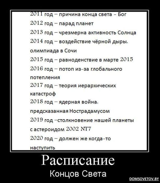 ЗЫ. Кстати в этом году уже 2 предсказаных конца света было, летом и осенью (термовспышка на солнце и ещё что то). |