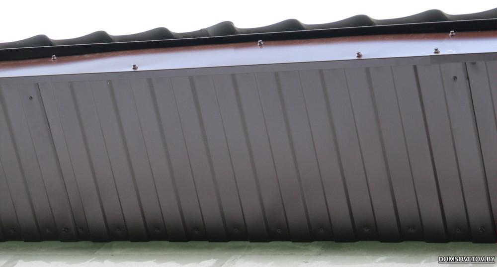 На карнизном свесе L-планка закреплена дополнительно саморезами, которыми к лобовой доске прикручиваются кронштейны водосточных желобов. Плюсы: - алюминиевый софит 1) не гремит на ветру, как пластиковый; 2)температурное расширение значительно меньше, чем у пластика; 3) не горюч; - ни на L-планке ни на софите нет "титек" (шляпок кровельных саморезов). Вообще саморезы не видны. Минусы: 1) алюминиевый софит дороже, чем пластиковый и металлический 2) трудоемкость монтажа подшивы со скрытым креплением 3) если придется разбирать, то придется разбирать один из свесов целиком [url="http://www.domsovetov.by/imagehosting/2015/09/04/195155e950d0bbc13.jpg"][img] ---------- Сообщение добавлено в 11:07 ---------- Предыдущее было в 11:07 ---------- http://www.domsovetov.by/imagehostin...950d0bbc13.jpg |