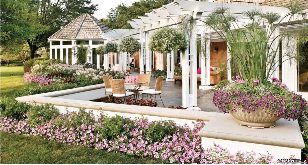 Еще любимая картинка, три цвета: зеленый газон, сиреневые петунии и белая мебель, а как эффектно. Сразу напрашивается вопрос, насколько сложно повторить такую клумбу, помню, что форумчанки рассаду петуний выращивали сами. А в грунте за ними ухаживать трудоемко?