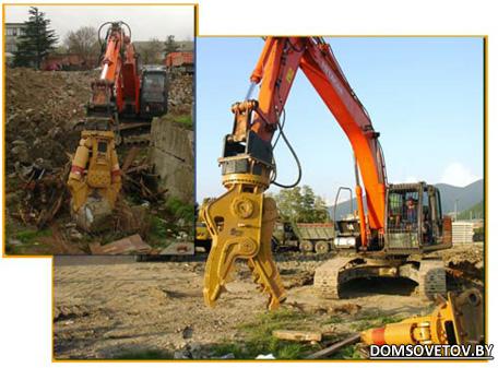 История развития техники для сноса зданий и сооружений, разрушения их строительных конструкций механическим способом показывает, что основным рабочим органом для этих целей служил металлический шар (шар-баба), подвешиваемый на тросе к стреле канатного экскаватора. Машинисту экскаватора требовалась особая квалификация (опыт) управления механизмами машины, чтобы попасть таким небезопасным орудием в намеченное место на здании или сооружении. Повышенная динамика отрицательно сказывалась на долговечности узлов и механизмов, металлоконструкции рабочего оборудования, опорноповоротного устройства. http://www.domsovetov.by/picture.php...&pictureid=868 С развитием гидропривода появилась возможность создания принципиально новых конструкций рабочих органов для вышеуказанных целей. Навешивая их на жестком рабочем оборудовании (в отличие от канатной подвески) гидропривод позволил создавать большие сконцентрированные усилия на режущих и ломающих элементах рабочих органах. Вращение (ротация) самого рабочего органа еще больше расширило возможность их применения, особенно в труднодоступных местах зоны работы. Ведущие экскаваторные фирмы еще в 70-х годах прошлого столетия перешли к выпуску нетрадиционных видов сменного рабочего оборудования и рабочих органов, пытаясь наиболее полно использовать возможности гидравлических экскаваторов, расширить область их применения. К таким нетрадиционным рабочим органам можно с уверенностью отнести гидрокусачики (бетоноломы), нашедшие широкое применение в технологических процессах разрушения бетонных и железобетонных конструкций в настоящее время. Однако использование гидромолотов при этих работах не всегда целесообразно, особенно при разрушении бетонных конструкций, имеющих металлическую связку в виде арматуры, сваренных швеллеров, уголков и т.д. К тому же следует отметить, что нормы по ограничению воздействия шума и вибрации также не позволяют в полной мере осуществлять их эксплуатацию вблизи жилых домов и в ночное время. http://www.domsovetov.by/picture.php...&pictureid=869 С этих позиций более эффективными сменными рабочими органами являются гидрокусачики (гидроножницы). Преимущества, заложенные в их конструктивные исполнения настолько очевидны, что можно с полной уверенностью сказать, что это наиболее важный и нужный рабочий орган гидравлического экскаватора при выполнении работ в строительстве при сносе ветхих зданий и сооружений, а также высокоэффективный в чрезвычайных ситуациях при разборке завалов разрушенных зданий взрывом или землетрясениями. Гидроножницы в зависимости от технологии работ можно подразделить по их назначению: Для первичной работы с бетонными и железобетонными конструкциями сносимых зданий, предназначенных для их разборки, разрыва их арматурных и сварных связей, раздробления на крупные части. Для вторичной работы с бетонными и железобетонными конструкциями, предназначенных для измельчения крупных частей после первого этапа работ. Для резки металла, т.е. окончательного разделения связанных металлических элементов (арматуры, швеллеров, уголков и т.д.) на мелкие части, позволяющих их свободную погрузку в автотранспорт для вывоза с объекта. Для окончательной резки на металлоутилизирующих предприятиях. Конструктивно гидрокусачики (гидроножницы) состоят из корпуса, к которому крепятся 