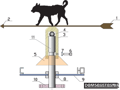 Устройство флюгера (см. рис). Направление ветра определяется по положению флюгарки, состоящей из пластины 1, и противовеса 2. Пластиной может служить плоская фигурка. Важно сбалансировать вес фигурки и противовеса, тогда боковая нагрузка на ось будет минимальна, а это влияет на срок службы флюгера. Флюгарка, будучи закрепленной на металлической гильзе 3, закрытой с одной свободно вращается на стальном стержне 11.