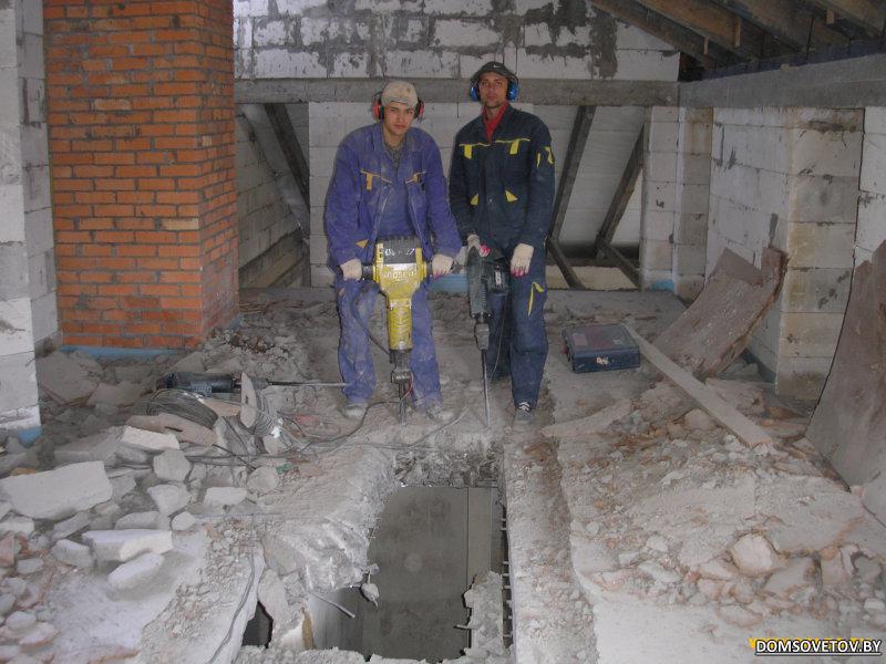Долбление, разрушение строительных конструкций отбойными молотками, бетоноломами.