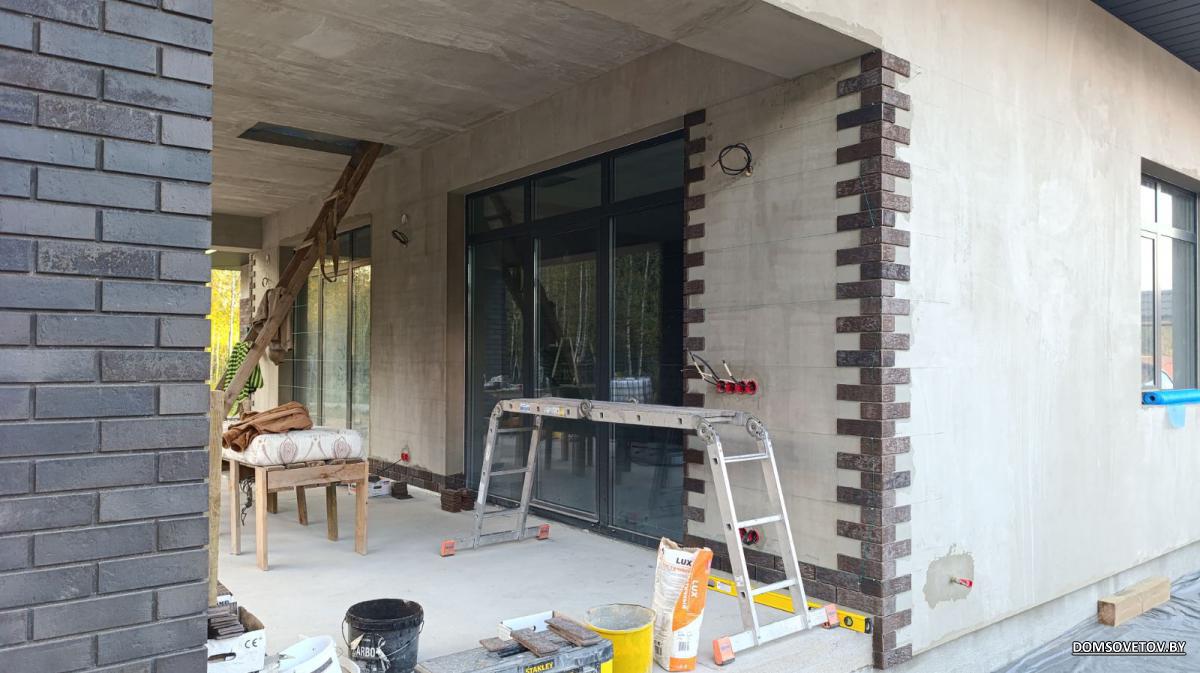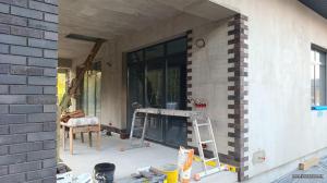 Немного процесса укладки плитки потому как я вижу у разных исполнителей могут быть разные подходы. В первую очередь расчет по высоте чтобы в нужную верхнюю точку придти в полный кирпич, размечаются каждые 4 ряда, натягивается шнурка по разметке, в первую очередь выкладываются углы дома, затем окна с учетом шва. К окну можем придти в целый кирпич/пол кирпича или нет, в рамках разумного шириной шва можно поиграть и вытянуть пару см где это важно, но эта техника имеет свои пределы/ограничения. Когда разметка сделана то просто клеится кирпич. Не используются никакие доп направляющие, фиксаторы шва и тому подобное.