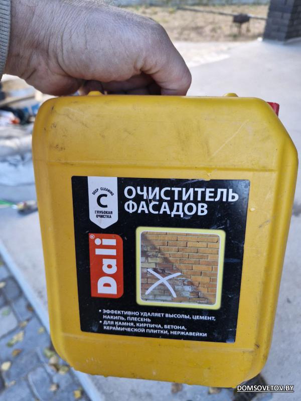 Я использовал такое. Оно еще прекрасно удаляет высохшие загрязнения цементными растворами. Когда укладывал плитку вымазал фасад фугой. Потом этим очистителем отмыл.