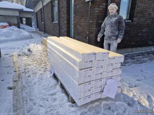 В кадре НЕ снежный человек, это маляр Сергей. Помог оперативно занести доску в дом. А белый весь потому как идет шлифовка стен. |