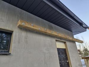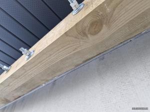 Одел брус на шпильки, работали в троем. Без кувалды не справились бы. Продолжаю постепенно дальше собирать конструкцию.